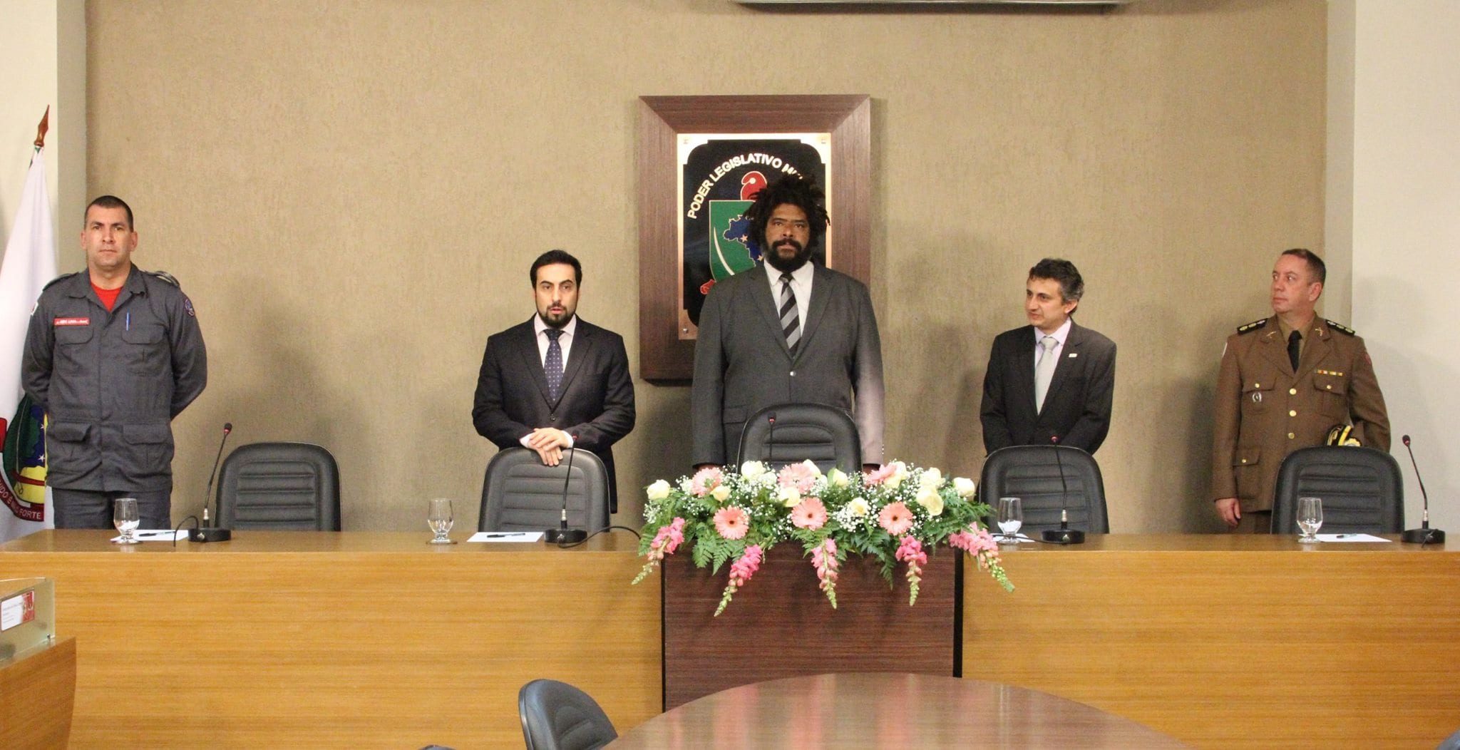 Compuseram a Mesa Diretora da sessão, além do Vereador Geraldo Luís Andrade e do representante da Rádio Montanhesa, Bruno Torres, o Prefeito Municipal, Ângelo Chequer (PSDB), o Comandante da 10ª Cia Independente da Polícia Militar, Tenente-Coronel Wallace Brandão, e o Comandante do Pelotão do Corpo de Bombeiros Militar, 2º Tenente Alexandre Fagundes.