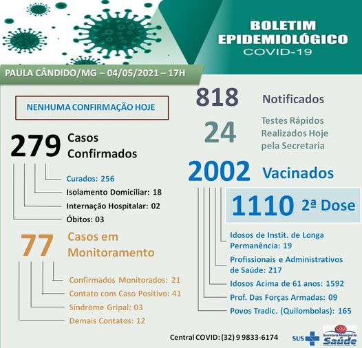 Paula Cândido e Araponga não tiveram registros de óbitos e casos confirmados hoje. Pedra do Anta não havia divulgado o boletim até a publicação desta matéria.