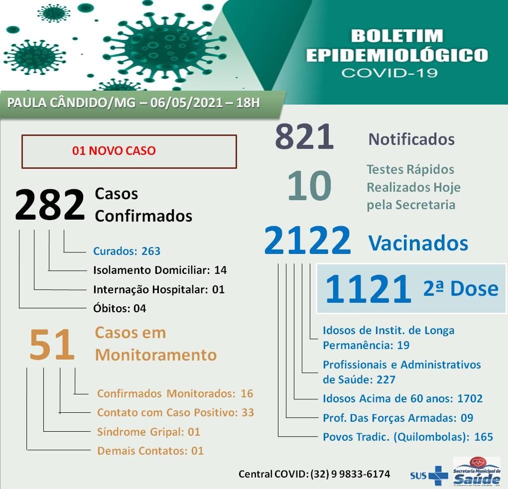 Paula Cândido confirmou um novo caso de COVID-19, na zona urbana. Com isso o município tem agora 282 casos confirmados, sendo 263 curados, 14 em isolamento domiciliar, um internado e 04 óbitos.