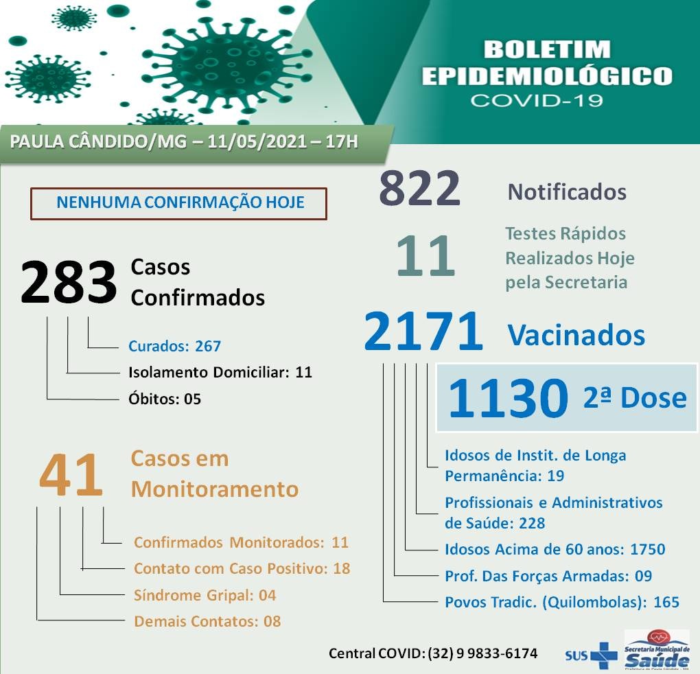 Paula Cândido não registrou casos ou óbitos nesta segunda-feira, 11. Paula Cândido segue com 283 casos confirmados, sendo 267 curados, 11 em isolamento domiciliar e 05 óbitos.
