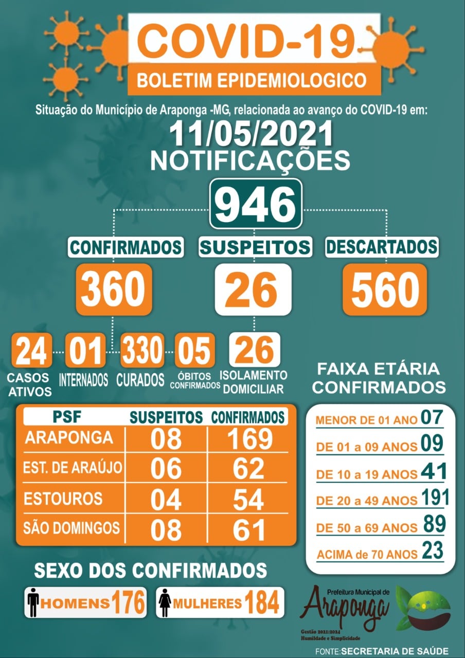 Araponga - Nesta terça-feira, 11, o município não registrou casos ou óbitos. Araponga segue com 360 casos confirmados até o momento, 330 curados, 24 casos ativos e 5 óbitos.