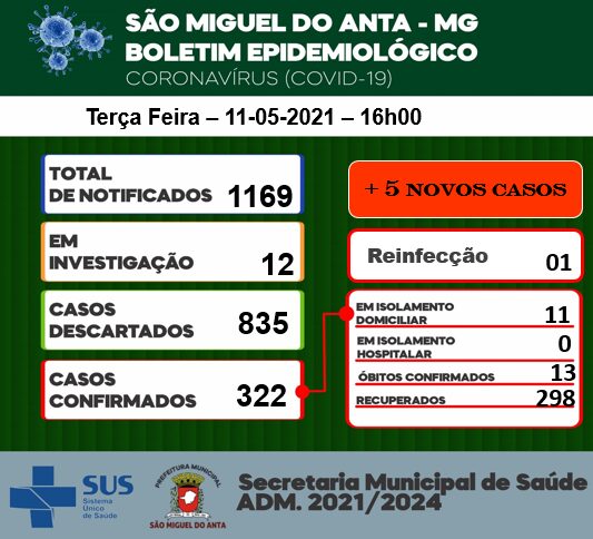 São Miguel do Anta registrou hoje 5 novos casos de coronavírus. O município tem até o momento 1.169 casos Notificados, destes, 835 casos foram descartados, 322 confirmados. Dos casos confirmados, 11 estão em isolamento domiciliar, 0 em isolamento hospitalar, 13 óbitos confirmados e 298 recuperados.