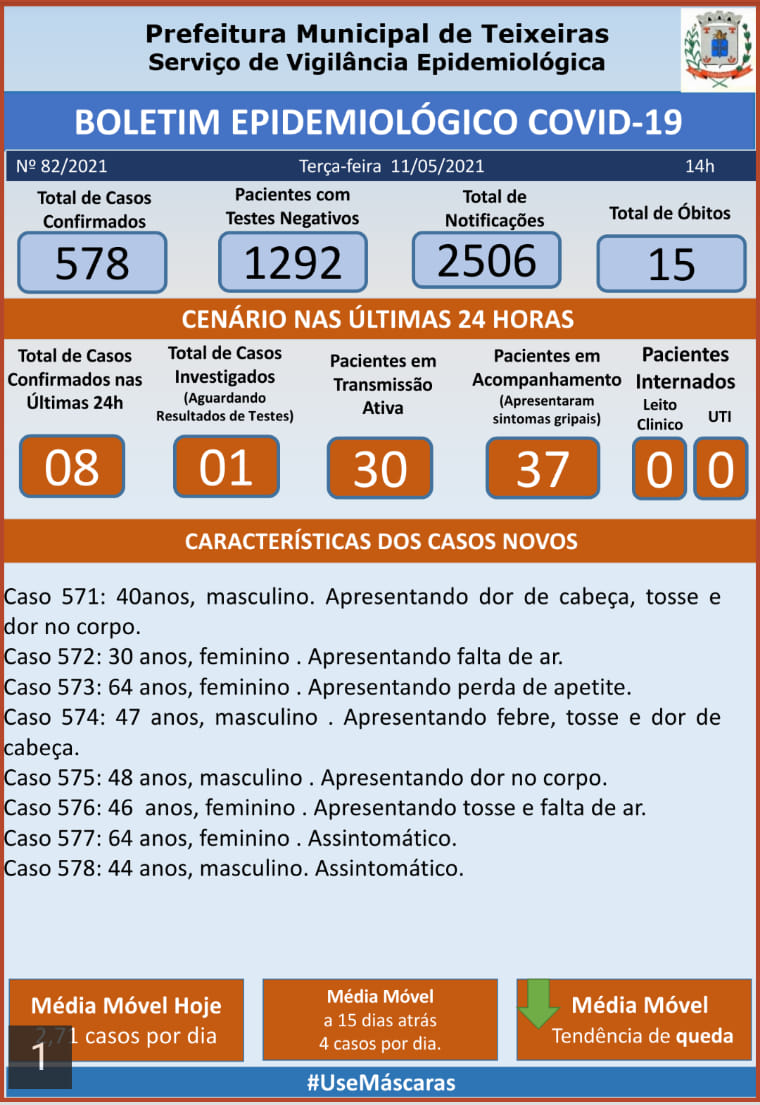 Teixeiras - Oito pessoas testaram positivo para a Covid-19 em Teixeiras hoje. O município tem 578 casos confirmados, um paciente investigado, 30 casos ativos, 37 pessoas estão sendo acompanhadas e 15 óbitos