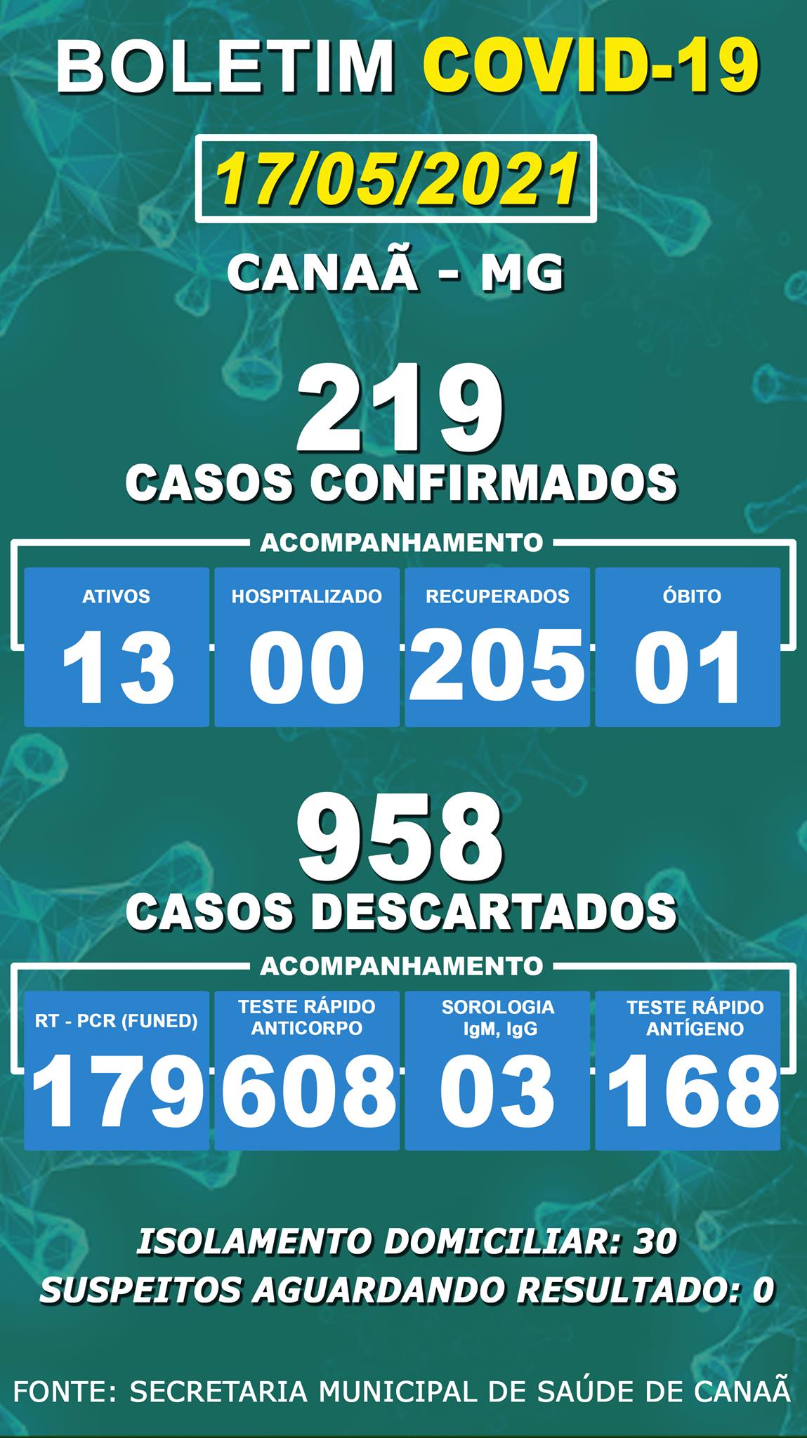 Canaã não registrou nesta segunda-feira, 17, casos confirmados ou óbitos por coronavírus. Canaã tem até o momento 219 confirmações, 205 recuperados, um óbito, 13 pessoas permanecem ativas e 30 em isolamento domiciliar.