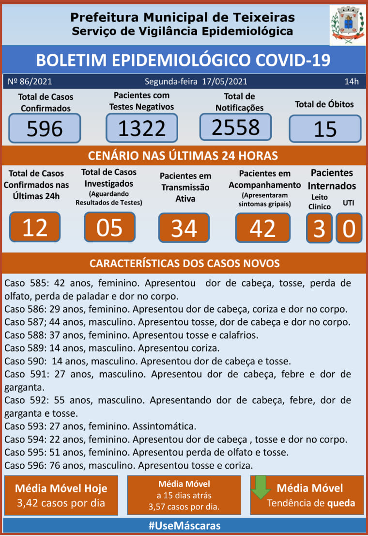 Teixeiras registrou 12 casos confirmados de coronavírus nesta segunda-feira, 17. Teixeiras tem 34 pacientes ativos, 42 pessoas em isolamento domiciliar 3 em leito clinico e 15 óbitos.