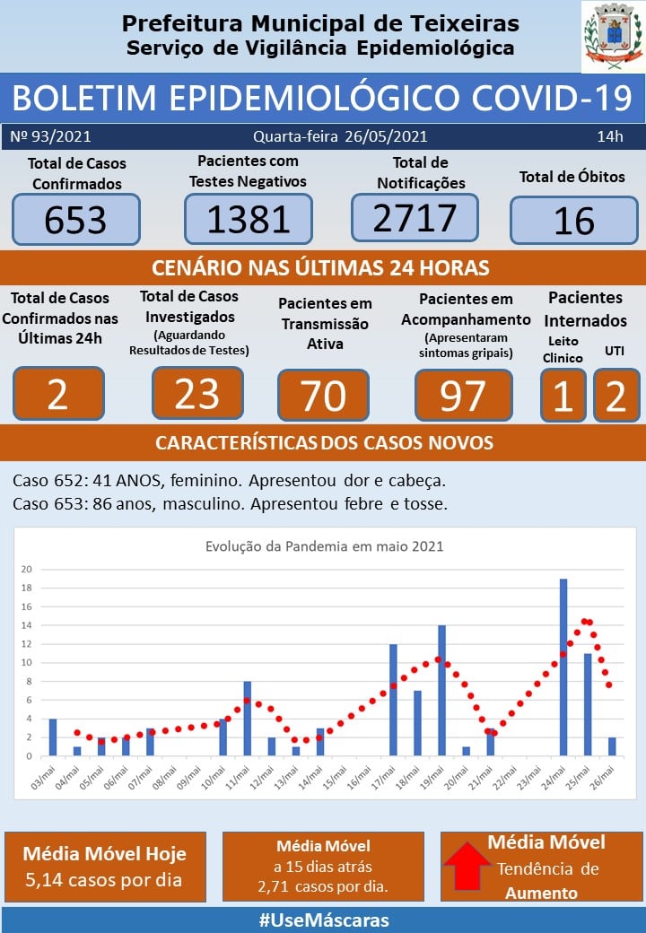 Teixeiras registrou 2 casos confirmados de coronavírus, nesta quarta-feira, 26. Teixeiras tem 653 casos confirmados, 70 pacientes ativos, 2 em leito de UTI e um em leito clinico além de 16 óbitos.