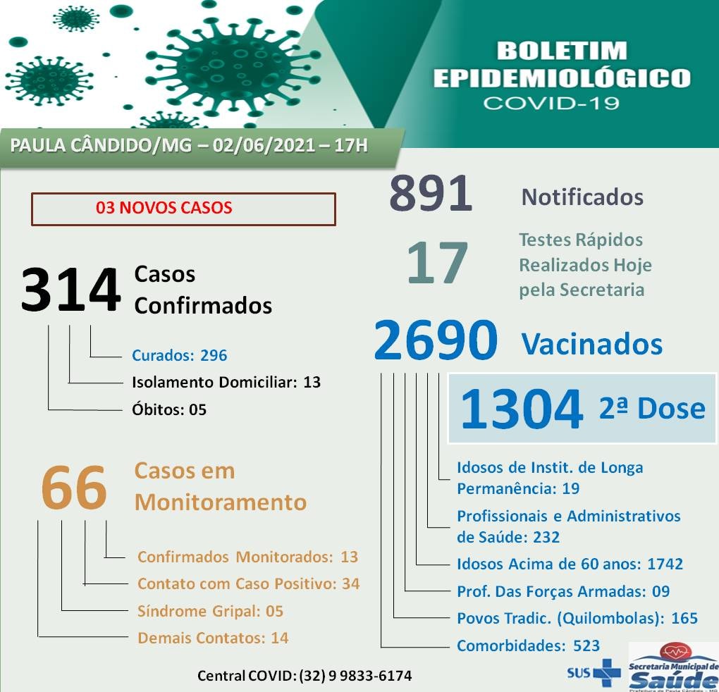 Paula Cândido registrou 3 novos casos da Covid-19 nesta quarta-feira, 2. O município está com 314 casos confirmados, além de 296 curados, 13 pessoas estão em isolamento domiciliar e 05 óbitos.
