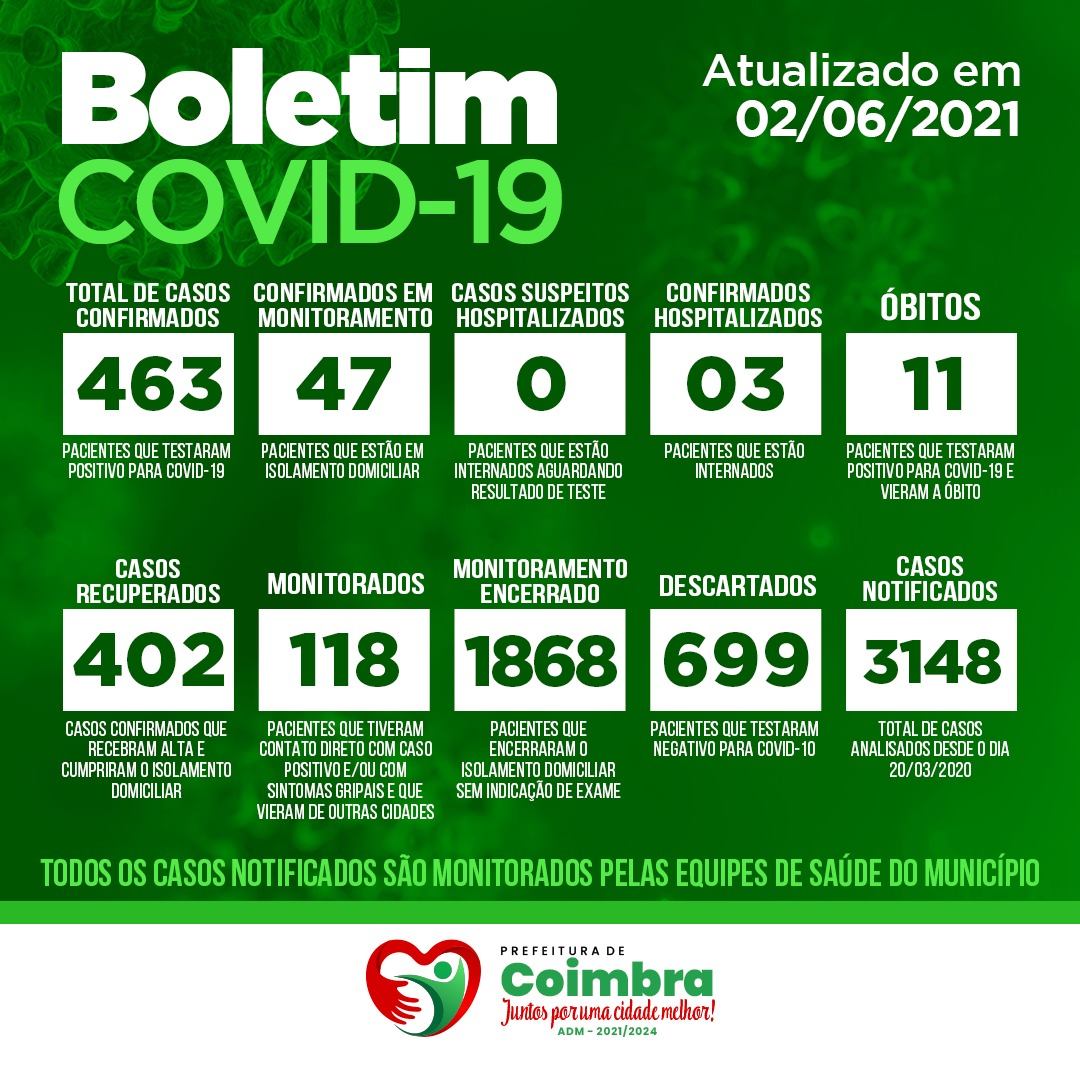 Coimbra registrou hoje 9 casos confirmados de coronavírus e mais um óbito. De acordo com informações da prefeitura, o município registrou o 11° óbito pela Covid-19. Foi confirmado positivo o resultado do exame RT-PCR do óbito suspeito, informado no boletim de 1 de junho. Paciente com faixa etária de 80 a 90 anos. O município tem, agora, 463 casos confirmados, 402 pessoas recuperadas, 47 em isolamento domiciliar e 11 óbitos. Um Paciente do sexo masculino, com faixa etária de 60 a 70 anos e uma mulher na faixa etária de 50 e 60 anos foram internados no Hospital São João Batista de Visconde do Rio Branco devido a complicações da doença.