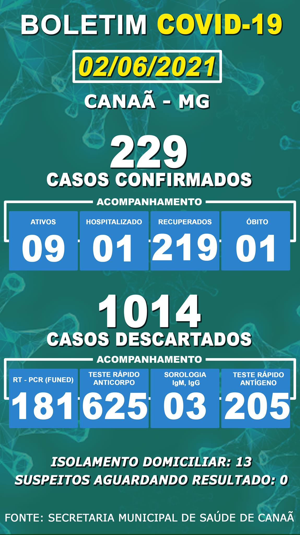 Canaã registrou 4 novos casos de coronavírus hoje. A cidade tem 229 confirmações, 219 recuperados, um óbito, 9 casos ativos e uma pessoa está hospitalizada.