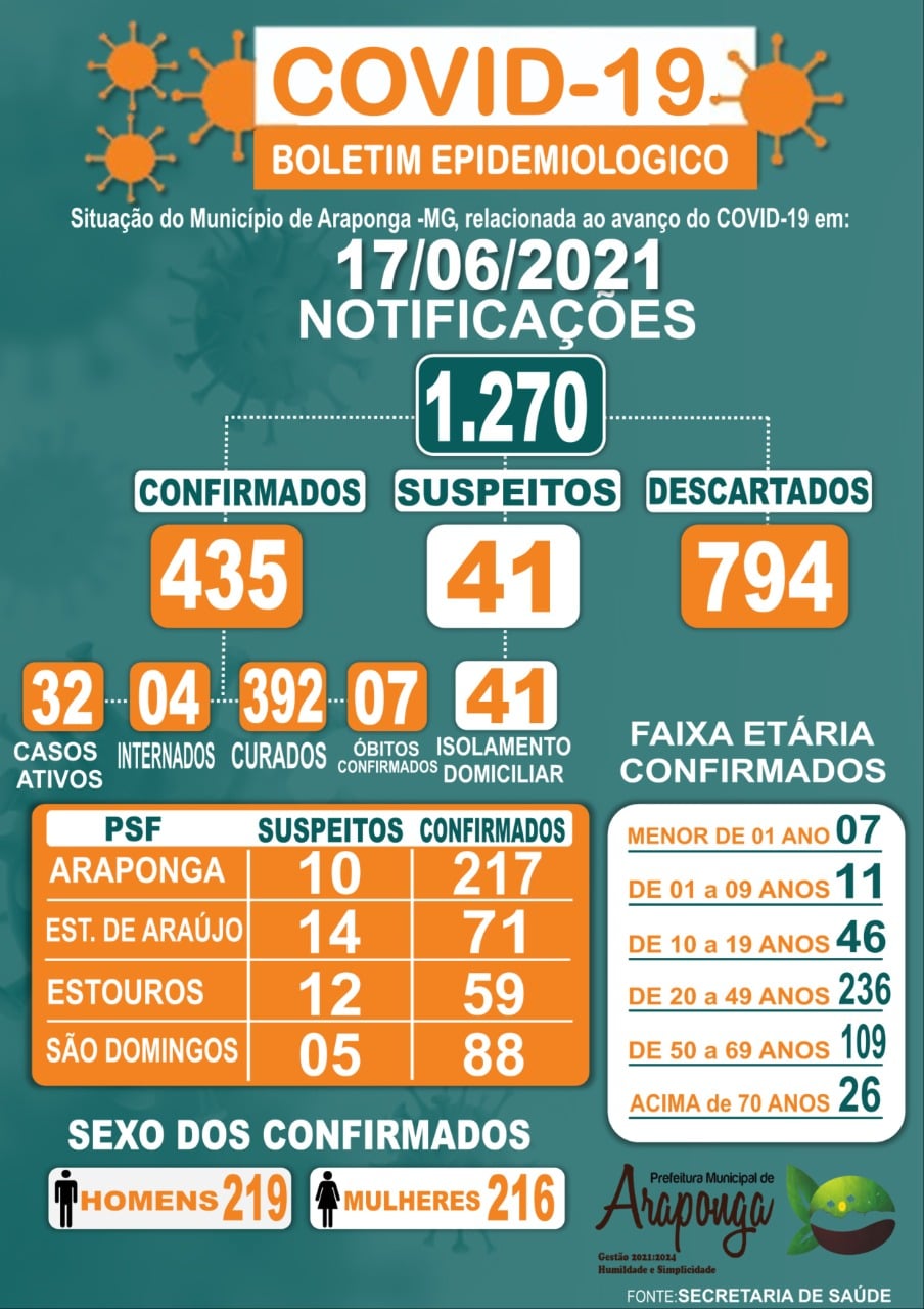 Araponga registrou no boletim desta quinta quatro casos positivos de coronavírus. Com as novas confirmações Araponga contabiliza 435 casos confirmados, 794 casos descartados, 392 curados, 32 pessoas ainda estão na forma ativa da doença, 4 pessoas estão internadas, 41 em isolamento domiciliar e 7 óbitos.