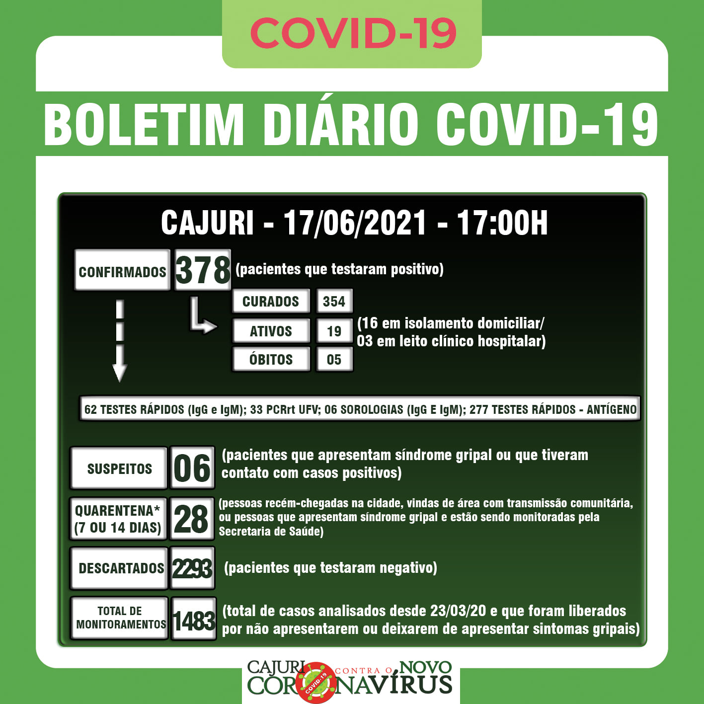Cajuri também registrou 4 novos casos confirmados de coronavírus no boletim de hoje. A cidade tem agora 378 casos confirmados, 354 curados, 5 óbitos e 19 pacientes ativos, 16 pessoas em isolamento social e três internadas em leito clínico, sendo duas delas no Hospital São João Batista e uma no Hospital São Sebastião, em Viçosa.