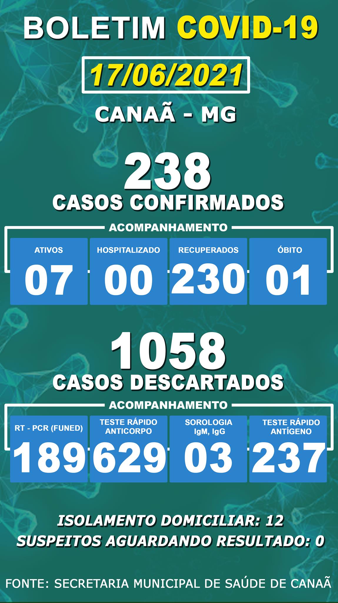 Canaã registrou um novo caso nesta quinta-feira. A cidade tem agora 238 confirmações, 230 recuperados, um óbito e 7 casos ativos.