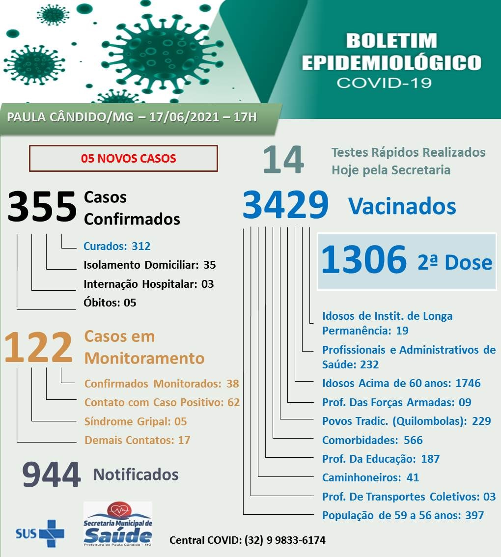 Paula Cândido registrou hoje cinco novos casos de coronavírus. Agora, a cidade tem 355 confirmações, além de 312 curados, 35 pessoas estão em isolamento domiciliar, 3 pacientes estão internados e 05 óbitos.