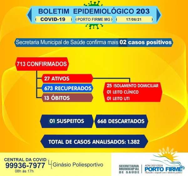 Em Porto Firme foram registrados hoje 2 novos casos de coronavírus. Com os novos casos Porto Firme agora tem 713 casos confirmados, 27 casos ativos, 673 recuperados e 13 óbitos. O município tem ainda 25 pessoas em isolamento domiciliar, duas estão internadas, uma em leito clinico e outra em leito de UTI.