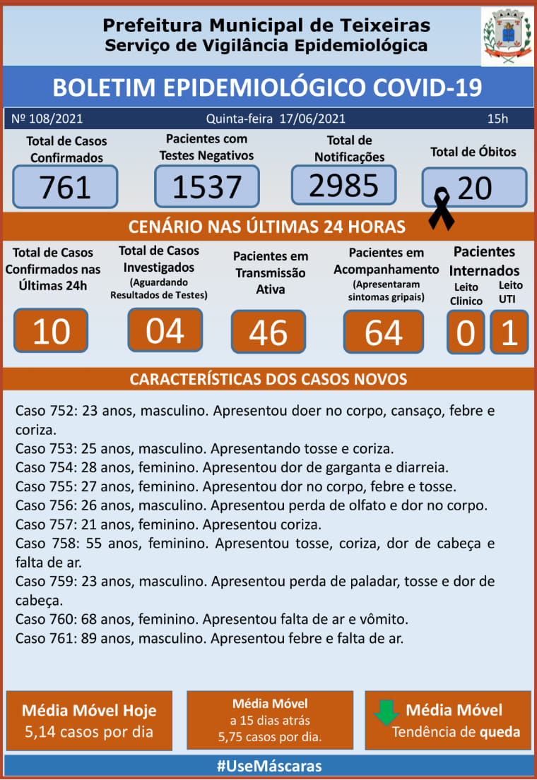 Teixeiras registrou hoje 10 casos de coronavírus. O município tem 761 casos confirmados, 46 pacientes ativos, sendo que um está internados, 2 em leito de UTI. Além disso, a cidade registrou dois novos óbitos e, com isso, totaliza 20 mortes até o momento.