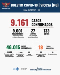 A Vigilância Epidemiológica confirmou mais sete casos positivos de Covid-19, nesta quinta-feira, 14. Agora, Viçosa contabiliza 9.161 confirmações, sendo que 9.001 pessoas já se recuperaram da doença. São 27 casos