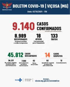 A Vigilância Epidemiológica confirmou mais quatro casos de Covid-19, nesta quinta-feira, 07. Agora, Viçosa contabiliza 9.140 confirmações, sendo que 8.989 pessoas já se recuperaram da doença. São 18 casos ativos