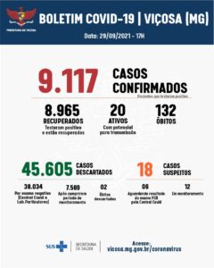 A Vigilância Epidemiológica confirmou mais dois casos de Covid-19, nesta quarta-feira, 29 de setembro. Agora, Viçosa contabiliza 9.117 confirmações, sendo que 8.965 pessoas já se recuperaram da doença. São 20