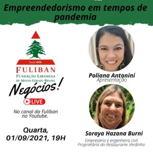 A Fundação Libanesa de Minas Gerais (Fuliban) realizará uma live nesta quarta-feira (01), às 19h, para tratar do empreendedorismo em tempos de pandemia. Para falar do assunto, Poliana Antonini recebe Soraya