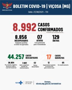 A Vigilância Epidemiológica confirmou mais seis casos positivos de Covid-19, nesta sexta-feira, 27. Agora, Viçosa contabiliza 8.992 confirmações, sendo que 8.856 pacientes já se recuperaram. São sete casos ativos e