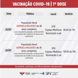 O Setor de Atenção Primária em Imunizações, da Secretaria Municipal de Saúde, divulga os dados da vacinação contra a Covid-19, referentes ao dia 20 de julho. Em Viçosa, já são