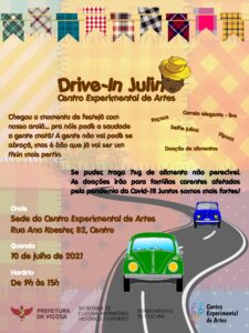 Neste sábado (10), a Secretaria de Cultura, Patrimônio Histórico e Esportes, por meio do Departamento de Cultura, realizará o Drive-In Julino, arraiá do Centro Experimental de Artes. Para evitar aglomerações,