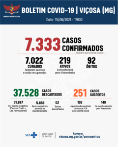 A Vigilância Epidemiológica confirmou mais 53 casos positivos de Covid-19, nesta terça-feira, 15. Agora, Viçosa contabiliza 7.333 confirmações, sendo que 7.022 pacientes já se recuperaram da doença. São 219 casos
