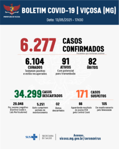 A Vigilância Epidemiológica confirmou mais dois óbitos e 39 novos casos de Covid-19, nesta quinta-feira, 13. Agora, Viçosa contabiliza 6.277 confirmações, sendo que 6.104 pessoas já se recuperaram. São 91
