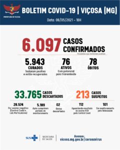 A Vigilância Epidemiológica registrou mais 45 casos positivos de Covid-19, nesta quinta-feira, 6. Viçosa contabiliza, agora, 6.097 confirmações, sendo que 5.973 pessoas já se recuperaram da doença. São 76 casos