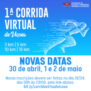 Com o fim da Onda Roxa, o Departamento de Esportes da Prefeitura Municipal de Viçosa estabeleceu novas datas para a I Corrida Virtual do município: o evento ocorrerá neste final