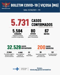A Vigilância Epidemiológica, nesta sexta-feira, 23, registrou mais 55 casos positivos de Covid-19. Agora, Viçosa contabiliza 5.731 confirmações, sendo que 5.584 pessoas já se recuperaram. São 80 casos ativos e