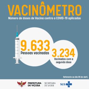 O Setor de Atenção Primária em Imunizações, da Prefeitura de Viçosa, registra 9.633 pessoas vacinadas com a 1ª dose da vacina contra a Covid-19. Desse total, 3.234 já receberam a