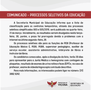 A Secretaria Municipal de Educação informa que a lista de classificação para os contratos temporários, através dos processos seletivos simplificados 003 e 005/2019, será publicada na quarta-feira, 31 de março.