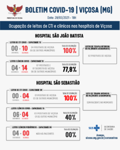 A Secretária Municipal de Saúde de Viçosa publicou ontem, domingo, 28 o boletim de internações dos hospitais São João Batista e São Sebastião. Além dos números de internações o boletim