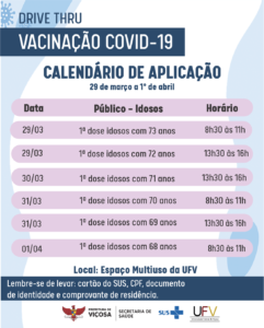 O Setor de Atenção Primária em Imunizações, da Prefeitura de Viçosa divulgou no último sábado, 27, o cronograma de vacinação contra a Covid-19 do dia 29/03 até 1º de abril.