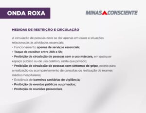 Veja a abaixo um vídeo explicativo divulgado pela Assembleia de Minas explicando a Onda Roxa do Minas Consciente. O governador Romeu Zema anunciou, na noite de segunda-feira (15/3), que a