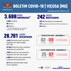 A Vigilância Epidemiológica confirmou mais 31 casos de Covid-19, em Viçosa, nesta sexta-feira, 5. O município contabiliza, agora, 3.688 confirmações, sendo que 3.568 pessoas já se recuperaram da doença. São