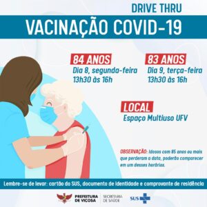 A Prefeitura de Viçosa, por meio do Setor de Atenção Primária em Imunizações, convoca os idosos com 83 e 84 anos completos para receberem a primeira dose do imunológico contra