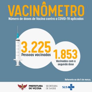 O Setor de Atenção Primária em Imunizações, da Prefeitura de Viçosa, registra 3.225 pessoas vacinadas contra a Covid-19. Desse total, 1.853 já receberam a segunda dose do imunológico. Nesta sexta-feira,