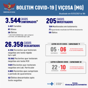 A Vigilância Epidemiológica registrou 38 novos casos de Covid-19, nesta segunda-feira, 1º de março. Agora o município contabiliza 3.544 confirmações, sendo que 3.437 pacientes já se recuperaram da doença. São