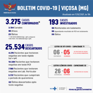 Mais 38 pessoas testaram positivo para a Covid-19, nesta quarta-feira, 17, conforme a Vigilância Epidemiológica. Viçosa contabiliza, agora, 3.275 confirmações, sendo 3.154 pacientes recuperados. São 98 casos ativos e 23