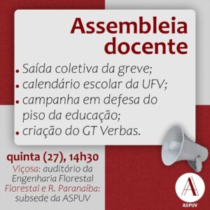 Na terça-feira (25), o Comando Local de Greve convocou uma Assembleia Geral para quinta-feira (27), presencialmente às 14:30, no Auditório do Departamento de Engenharia Florestal. As subsedes da ASPUV de Rio Paranaíba