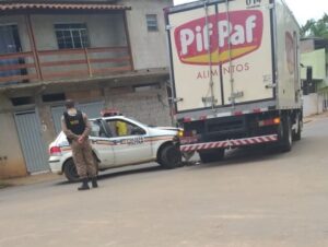 Viatura da PM colide em caminhão no Centro de Teixeiras