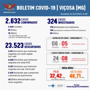 Viçosa chegou a 1.081 casos confirmados de COVID-19 no mês de janeiro. Até o último boletim epidemiológico divulgado nessa segunda-feira (25), o município registrou 7 mortes durante esse mês. Confira