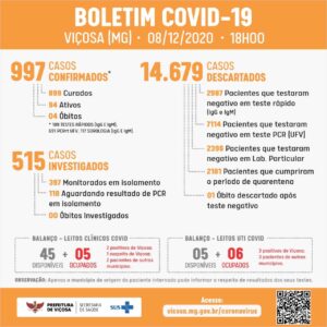 Viçosa registra mais um recorde de novos casos de coronavírus nesta terça (08). São 52 novos casos registrados em 24h. Do total, apenas um se trata de um paciente já