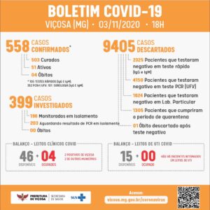 Mais 5 pessoas testaram positivo para a Covid-19 nesta terça-feira (03). O município soma 558 casos positivos da doença, sendo que 503 já foram curados, 51 estão na fase ativa