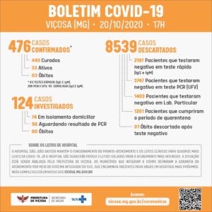 Mais 9 viçosenses testaram positivo para Covid-19 nesta terça-feira (20). O município soma agora 476 casos positivos, sendo 440 curados, 33 ativos e 3 óbitos. Com os novos dados, a