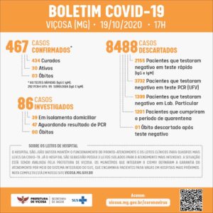 O boletim epidemiológico de Viçosa desta segunda-feira (19) confirmou 3 novos casos positivos de Covid-19 no município. Duas crianças de 2 anos e uma mulher de 25 anos foram infectadas.