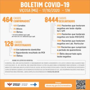 O boletim epidemiológico deste sábado (17) registrou mais 10 casos de coronavírus confirmados em Viçosa. O município chega a 464 casos, sendo 35 ativos, 426 curados e 3 óbitos. Sobre