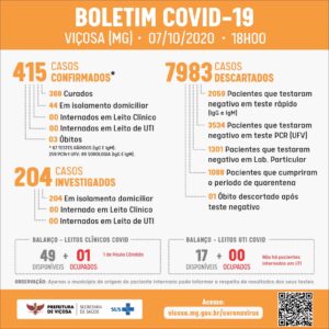 Chega a 415, o número de casos confirmados de Covid-19 no município de Viçosa. Boletim desta quarta-feira (07) informou que mais 6 pessoas testaram positivo para a doença no município.